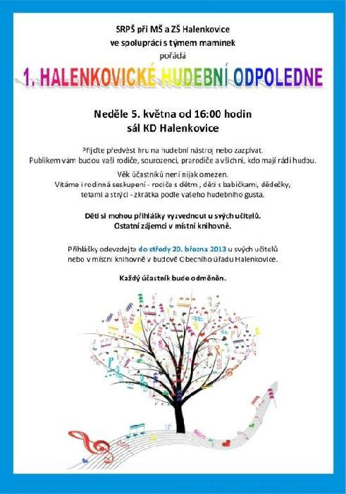 SRPŠ při ZŠ a MŠ Halenkovice ve spolupráci s týmem maminek pořádá v neděli 5. května 2013 od 16:00 hod. Halenkovické hudební odpoledne. Přijďte předvést hru na hudební nástroj nebo zazpívat. Věk účastníků není nijak omezen. Vítaná jsou i rodinná vícegenerační seskupení. Přihlášky si můžete vyzvednout a odevzdat u svých učitelů nebo v místní knihovně.